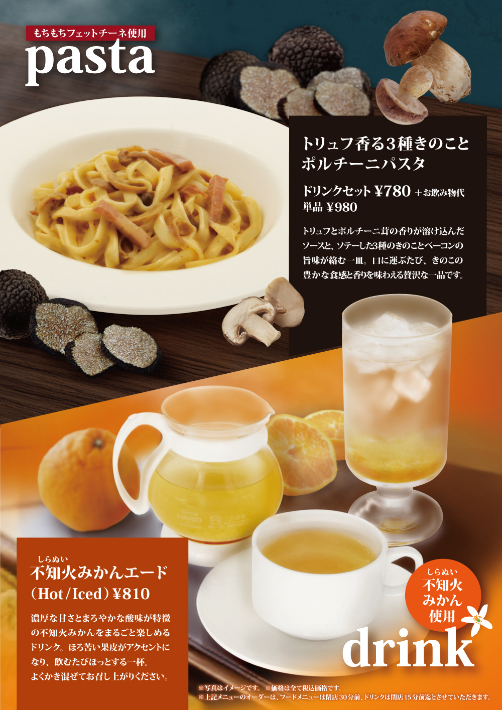 期間限定ドリンク 2025年11月20日(木) 開始 不知火みかんエード Hot/Iced ¥810 濃厚な甘さとまろやかな酸味が特徴の不知火みかんをまるごと楽しめるドリンク。ほろ苦い果皮がアクセントになり、飲むたびほっとする一杯。よくかき混ぜてお召し上がりください。 期間限定パスタ 2025年11月20日(木) 開始 トリュフ香る3種のきのことポルチーニパスタ ドリンクセット¥780+お飲み物代 単品/¥980 トリュフとポルチーニ茸の香りが溶け込んだソースと、ソテーした3種のきのことベーコンの旨味が絡む一皿。口に運ぶたび、きのこの豊かな食感と香りを味わえる贅沢な一品です。 >