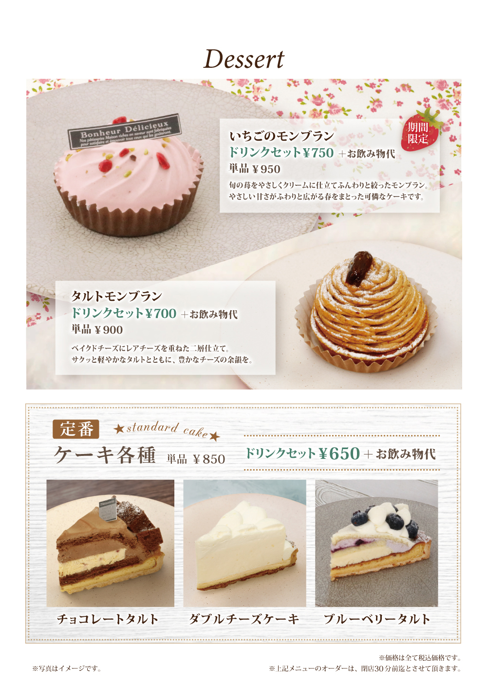 期間限定ドリンク 2026年3月16日(月) 開始 プレミアムいちごミルク Iced ¥770 いちごの果実を贅沢に搾ったソースを合わせた、プレミアムないちごミルクです。 期間限定パスタ 2026年3月16日(月) 開始 春薰る菜の花のボンゴレビアンコ ¥980 アサリの旨みと菜の花のほろ苦さが重なる、香り立つ春のボンゴレパスタ。 期間限定スイーツ 2026年3月1日(日) 開始 いちごのモンブラン ドリンクセット¥750+お飲み物 単品¥950 旬の苺をやさしくクリームに仕立てふんわりと絞ったモンブラン。やさしい甘さがふわりと広がる春をまとった可憐なケーキです。