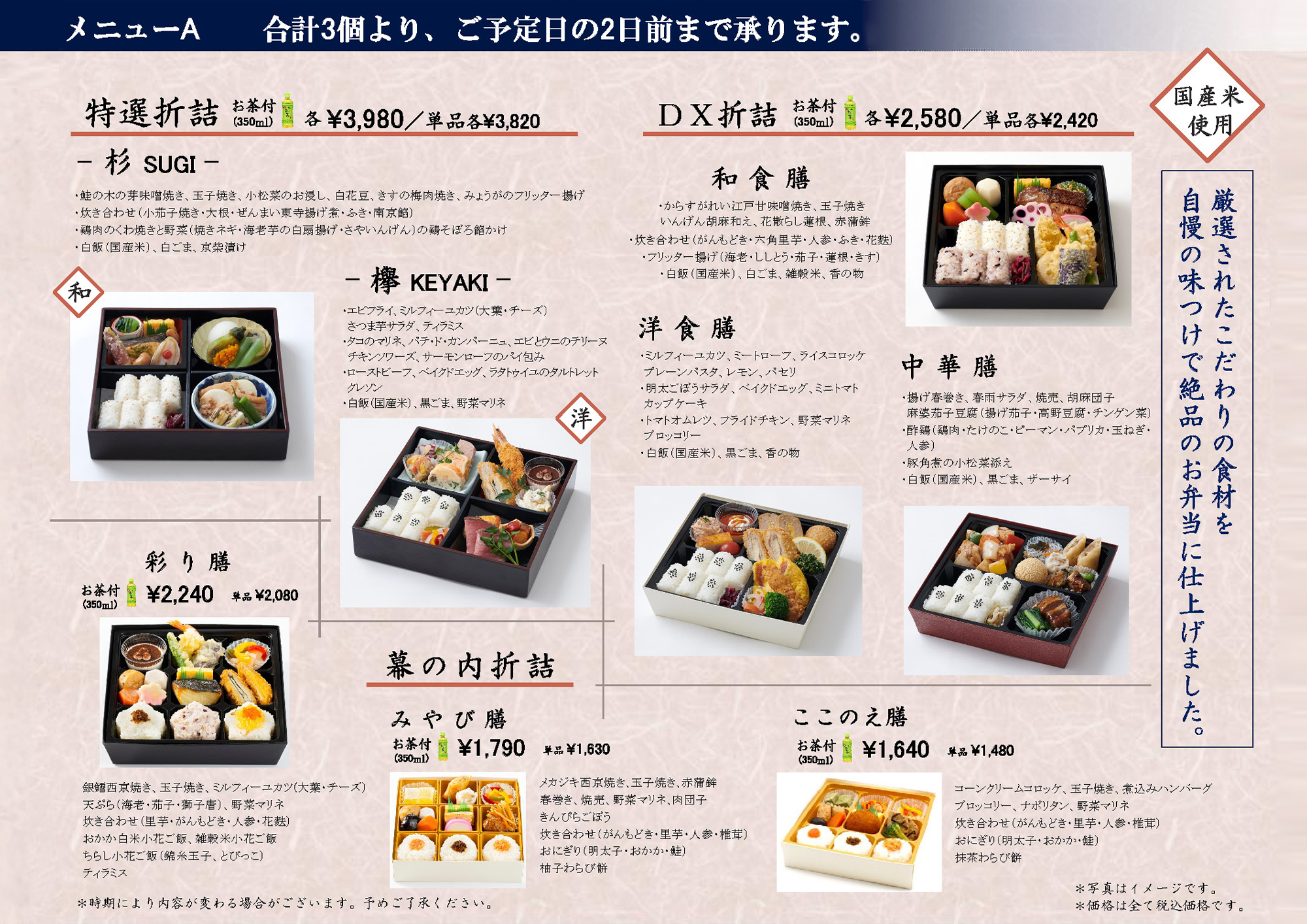 ※メニューBは、1種類10個(お茶付・単品選択可)より、ご利用日の7日前まで承ります。