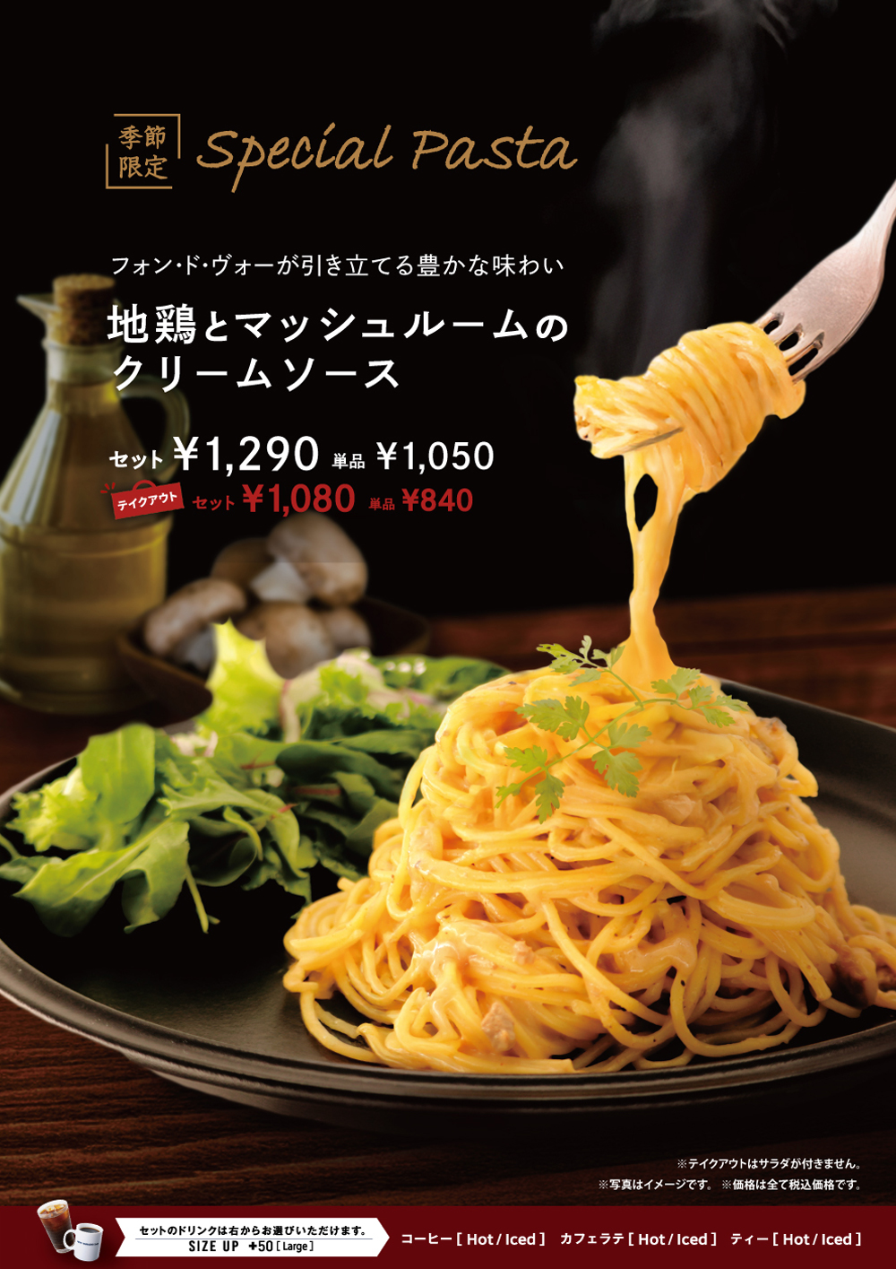 季節限定おすすめパスタ 2025年10月1日(水) 開始 地鶏とマッシュルームのクリームソース ●セット(サラダ付き) ¥1,290 / 単品 ¥1,050 ●テイクアウトセット(サラダなし) ¥1,080 / 単品 ¥840 地鶏の甘みとコク、マッシュルームの芳醇な風味をとじ込めたクリームソース。フォン・ド・ヴォーの深い旨みが重なり、ひと口ごとに広がる贅沢な味わいをお楽しみいただけます。 季節限定おすすめケーキ 2025年10月1日(水) 開始 国産ゆずと加賀棒ほうじ茶の和ごころズコット ¥610 まろやかで上品な加賀棒ほうじ茶のムースに、ゆずのさわやかな甘みがアクセント。ほんのり大人の風味が広がる、やさしい"和"の味わいです。 NEW YORKER'S Cafe インフォメーション 季節のおすすめ メニュー 当店のこだわり カロリー・アレルギー物質情報 店舗検索 採用情報 喫茶室ルノアール Cafeルノアール Cafe Renoir《New Style !!》 ミヤマ珈琲 CafeMiyama NEW YORKER’SCafe 貸会議室マイ・スペース 個人空間マイ・ブース BAKERYHINATA Alinecafé et sucreries